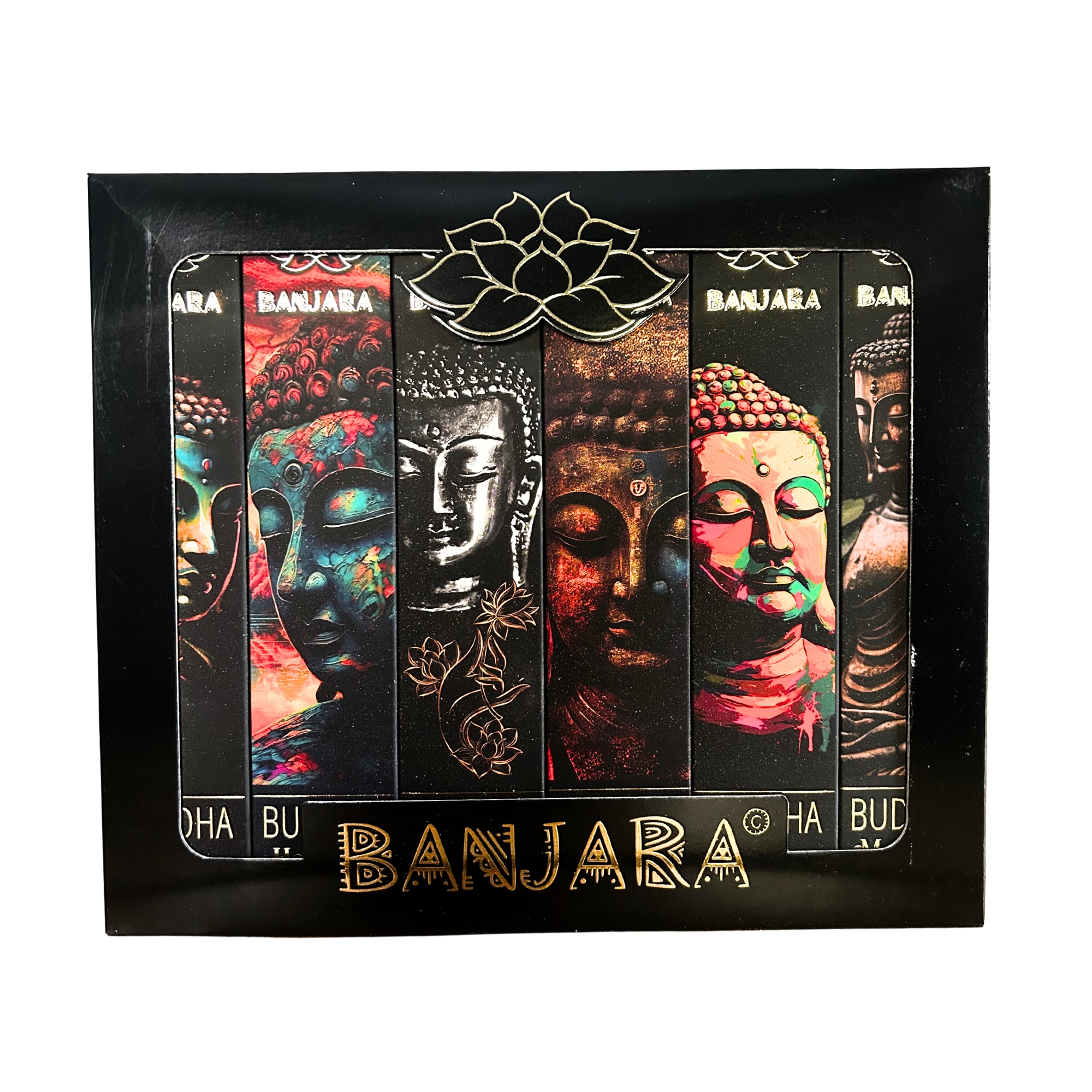A embalagem, elegante em preto e dourado com ilustrações detalhadas do Buda, é uma peça de destaque pronta para exposição.