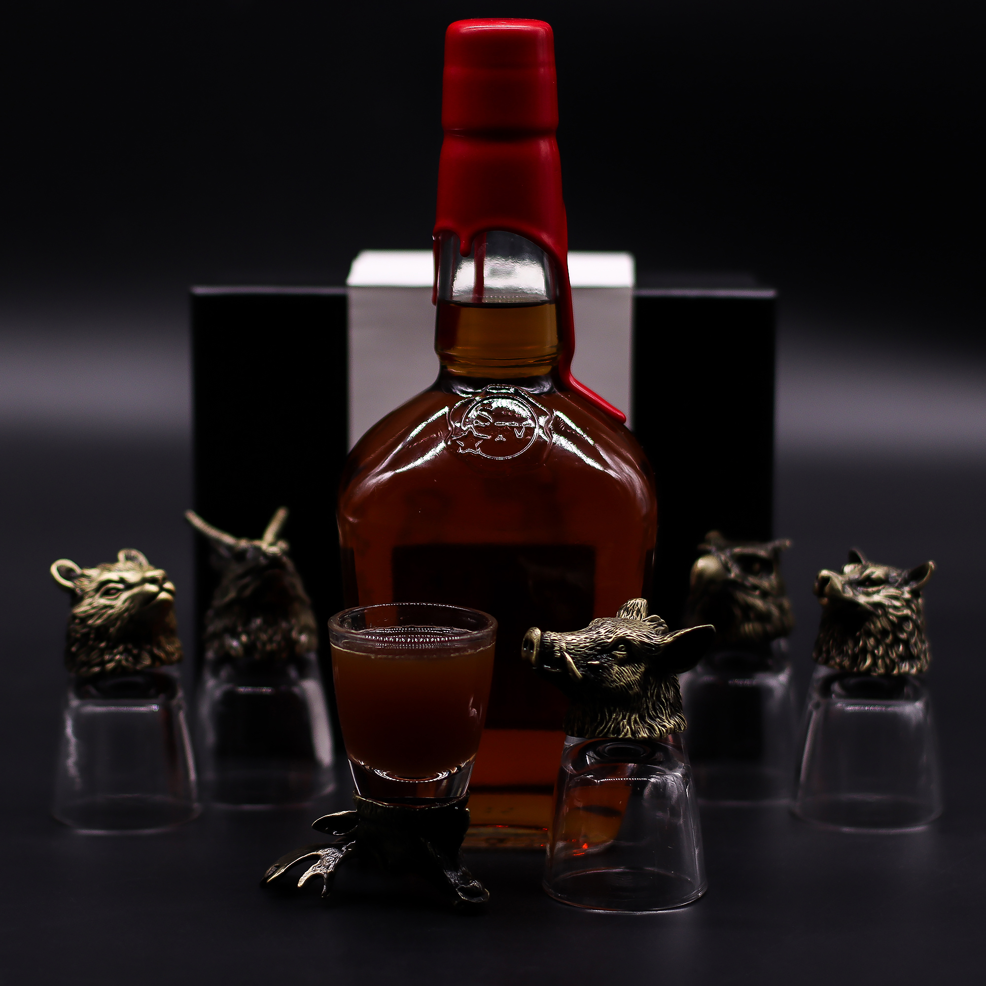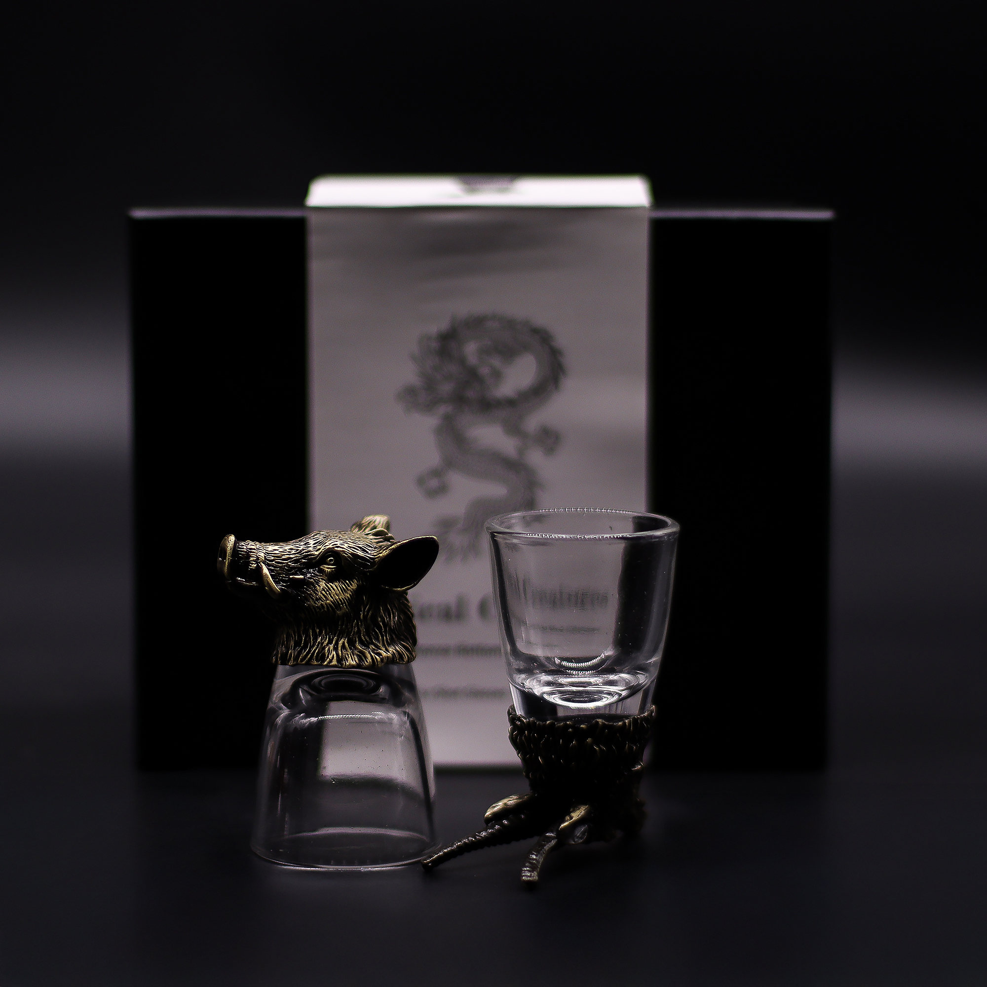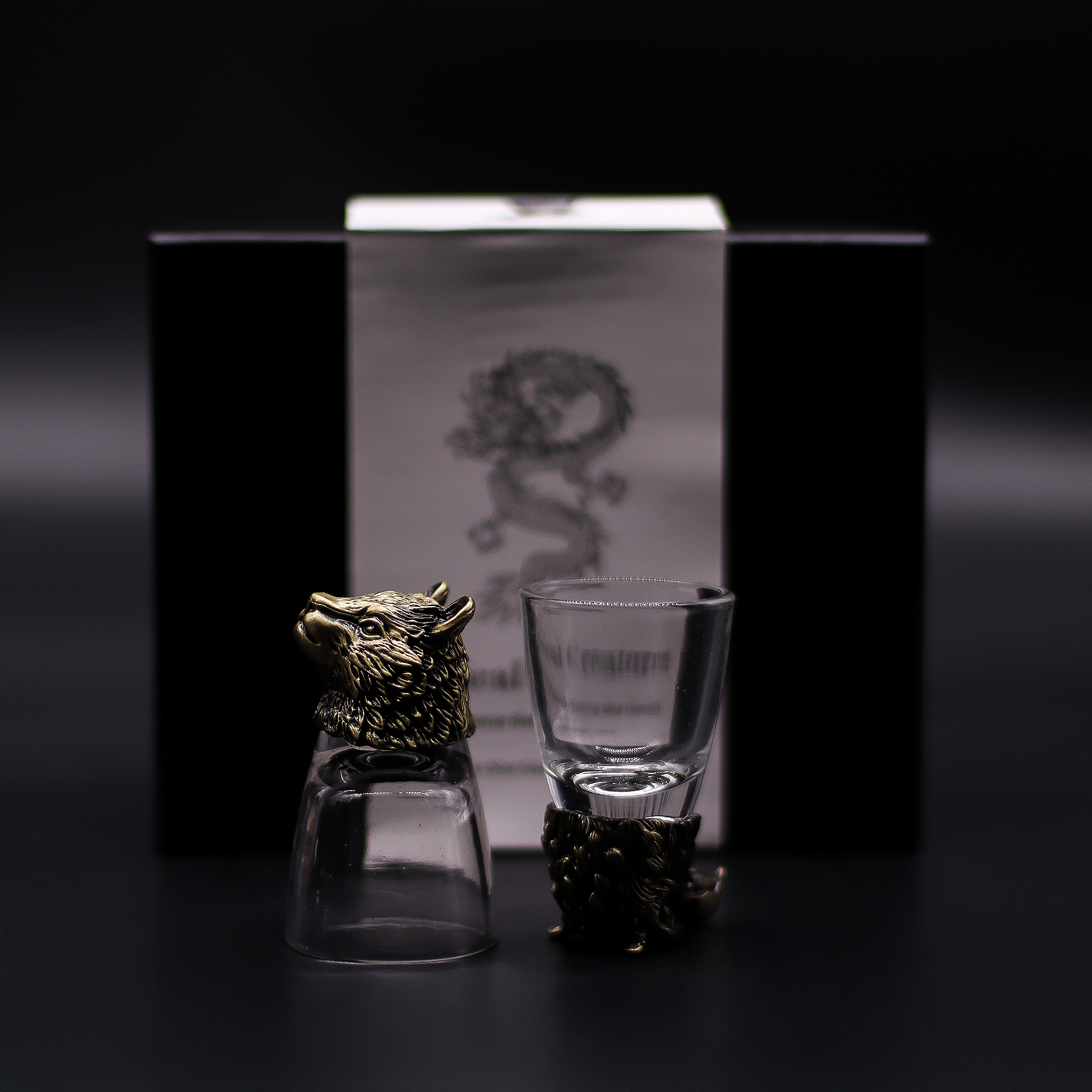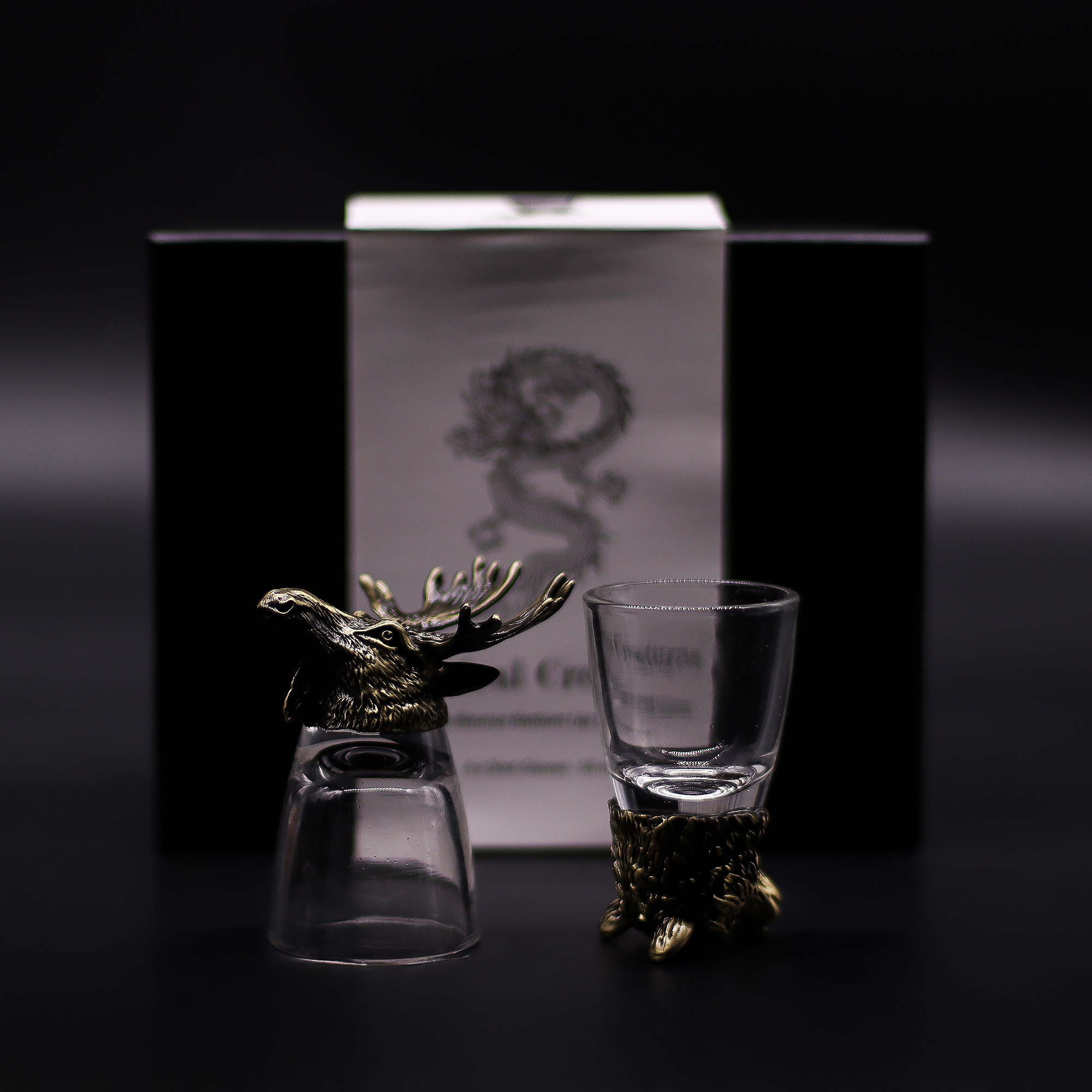 Conjunto de 6x Copos de Shot (50ml) – Criaturas da Floresta Selvagem em acabamento bronze antigo da AW Artisan Portugal. Cada copo é adornado com figuras detalhadas inspiradas na vida selvagem, como o alce símbolo de vitalidade e renovação e o urso força e proteção e outras criaturas emblemáticas que remetem ao espírito livre da floresta.