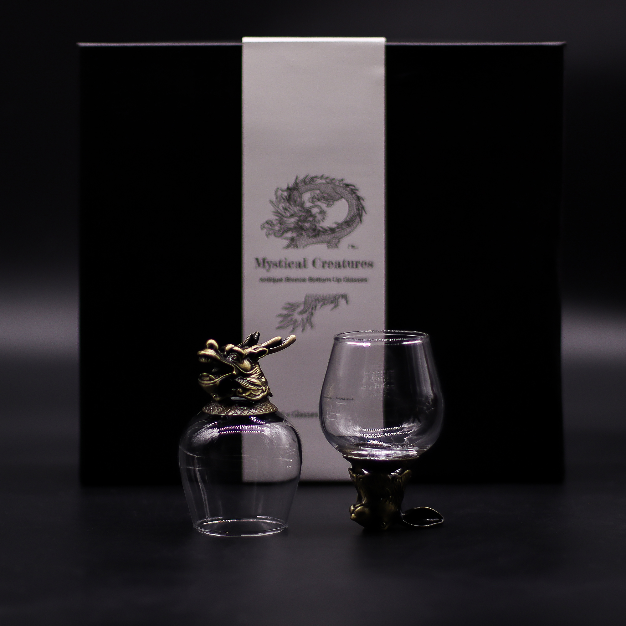 Conjunto de 6x Copos de Shot (100ml) – Criaturas Místicas em acabamento bronze antigo da AW Artisan Portugal. As figuras representam criaturas místicas como como o elefante, símbolo de força, longevidade e sorte, e o tigre, associado à coragem, poder e proteção espiritual.