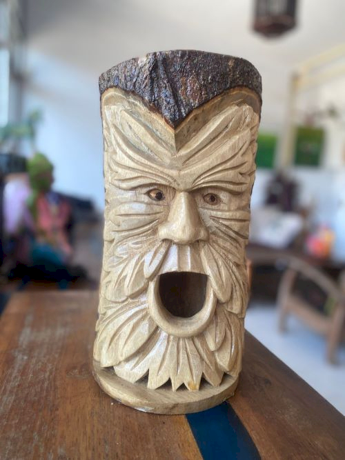 Feitas em Bali, as Casas de Pássaros com Cara em Tronco de Árvore – Greenman são peças artesanais únicas, talhadas diretamente em madeira natural. O seu design rústico, com rostos inspirados no espírito da natureza, torna-as num elemento decorativo impactante para jardins, varandas e qualquer espaço exterior que peça um toque mágico e selvagem.