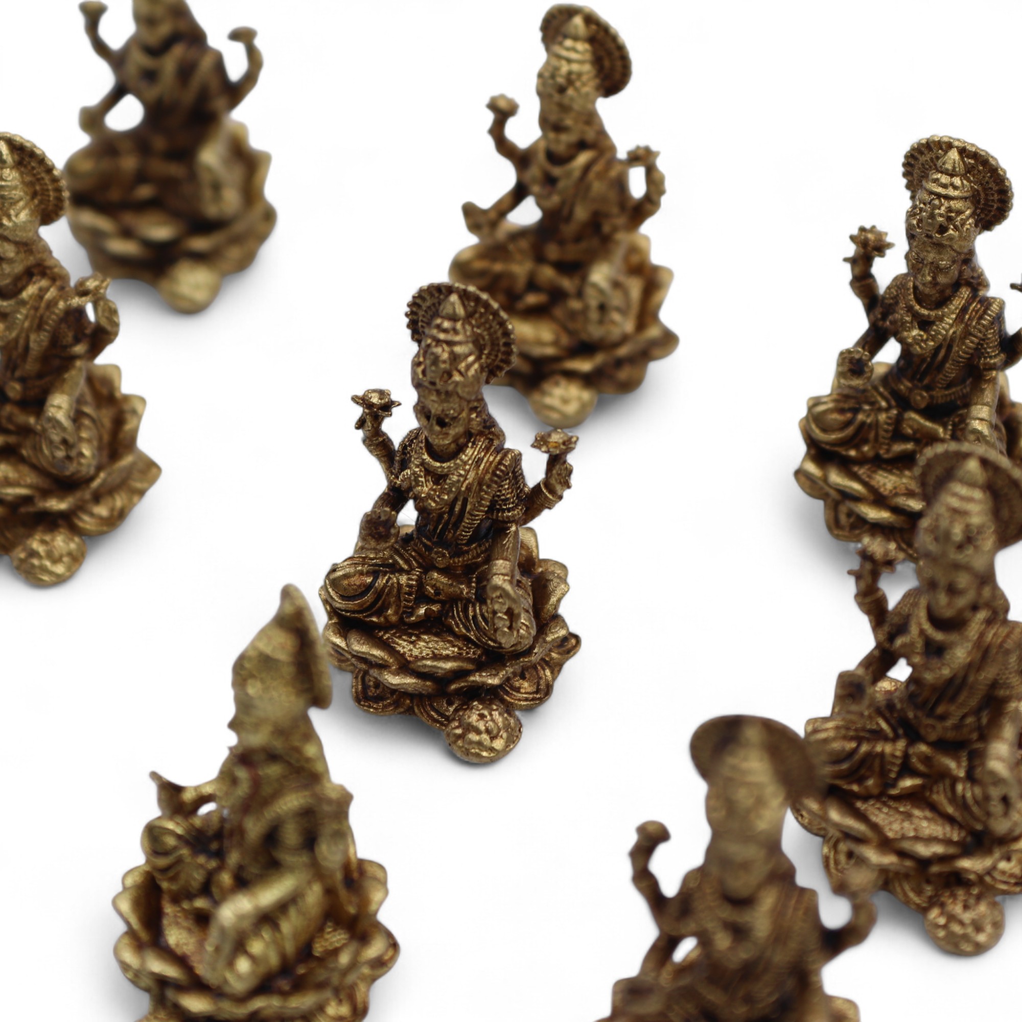 Laxmi, também chamada Lakshmi, é uma das divindades mais veneradas no hinduísmo, associada à riqueza material e espiritual. Geralmente representada sobre uma flor de lótus, simboliza pureza, generosidade e o fluxo contínuo de bênçãos. É especialmente celebrada no festival de Diwali, quando se invoca a prosperidade nos lares e negócios.