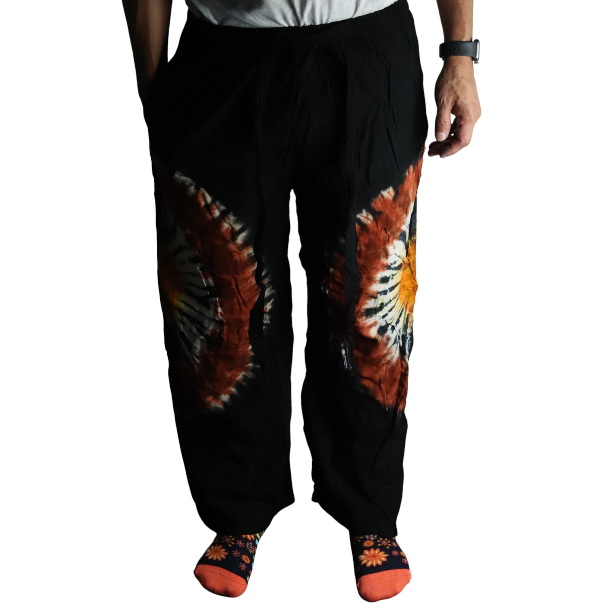 O fundo de chocolate combina com vibrantes detalhes tie-dye em laranja, criando um contraste marcante e um estilo artesanal único. O corte de perna larga e a cintura ajustável asseguram um ajuste confortável e favorecedor, adequado a várias idades e tipos de corpo. Autênticas e versáteis, são ideais para lounging, yoga ou looks casuais.