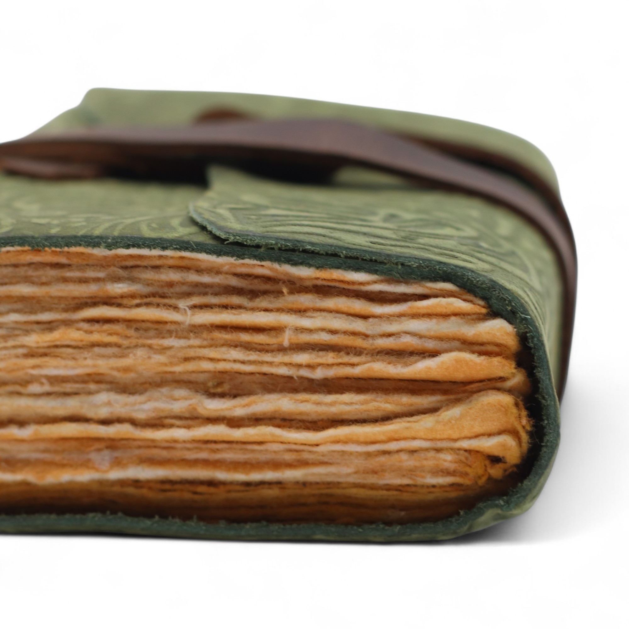 O Cadernos de Couro com Bordas Irregulares Grossas - Padrão Labirinto Verde é uma fusão perfeita entre artesanato tradicional e simbolismo espiritual. Cada caderno é feito à mão em couro genuíno, com bordas irregulares e um intricado padrão em relevo de labirinto, símbolo de sabedoria interior, jornada espiritual e autodescoberta.