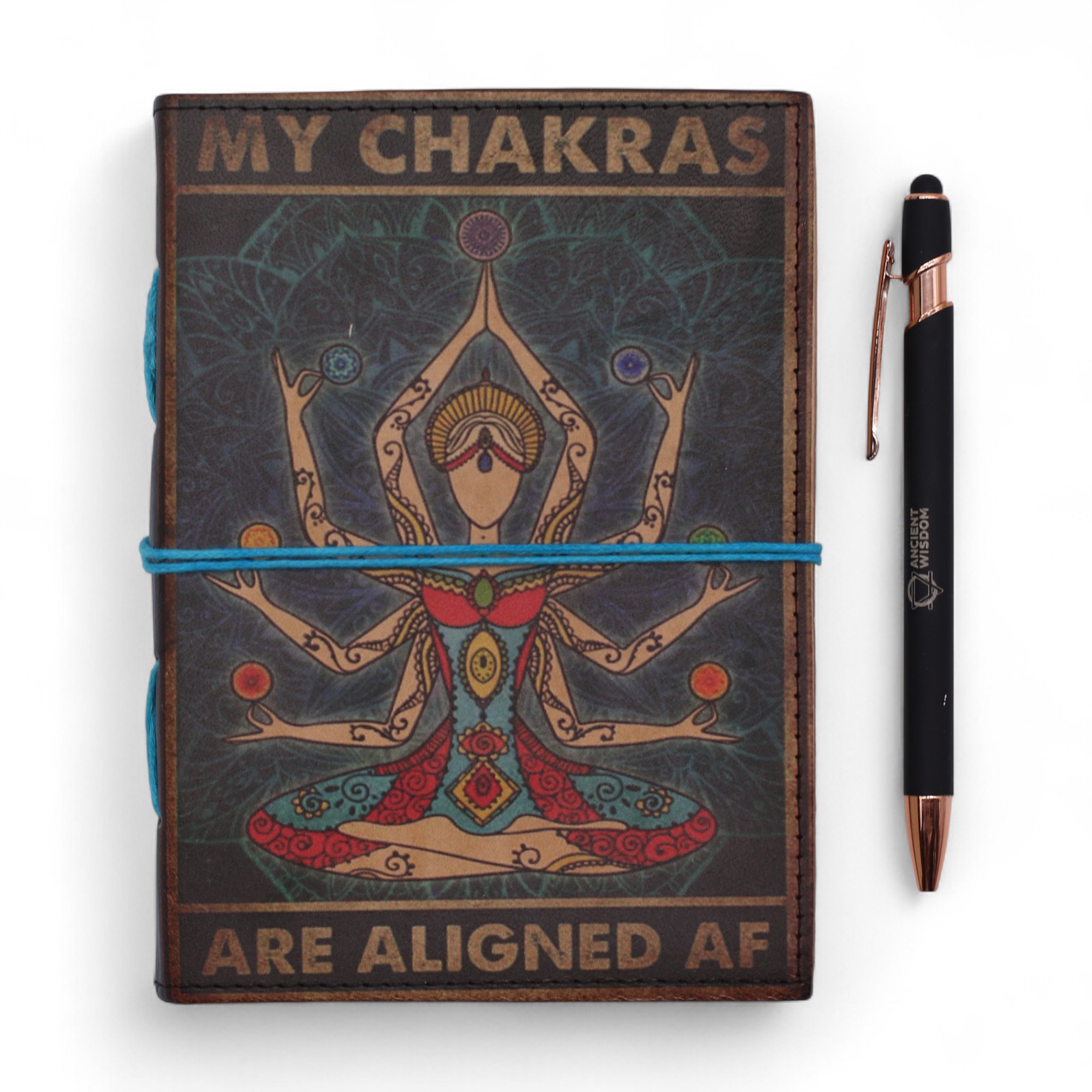 O Caderno de Couro Estampado “Os Meus Chakras Estão Alinhados” combina beleza, energia positiva e artesanato de qualidade, ideal para clientes que valorizam produtos com propósito e significado.