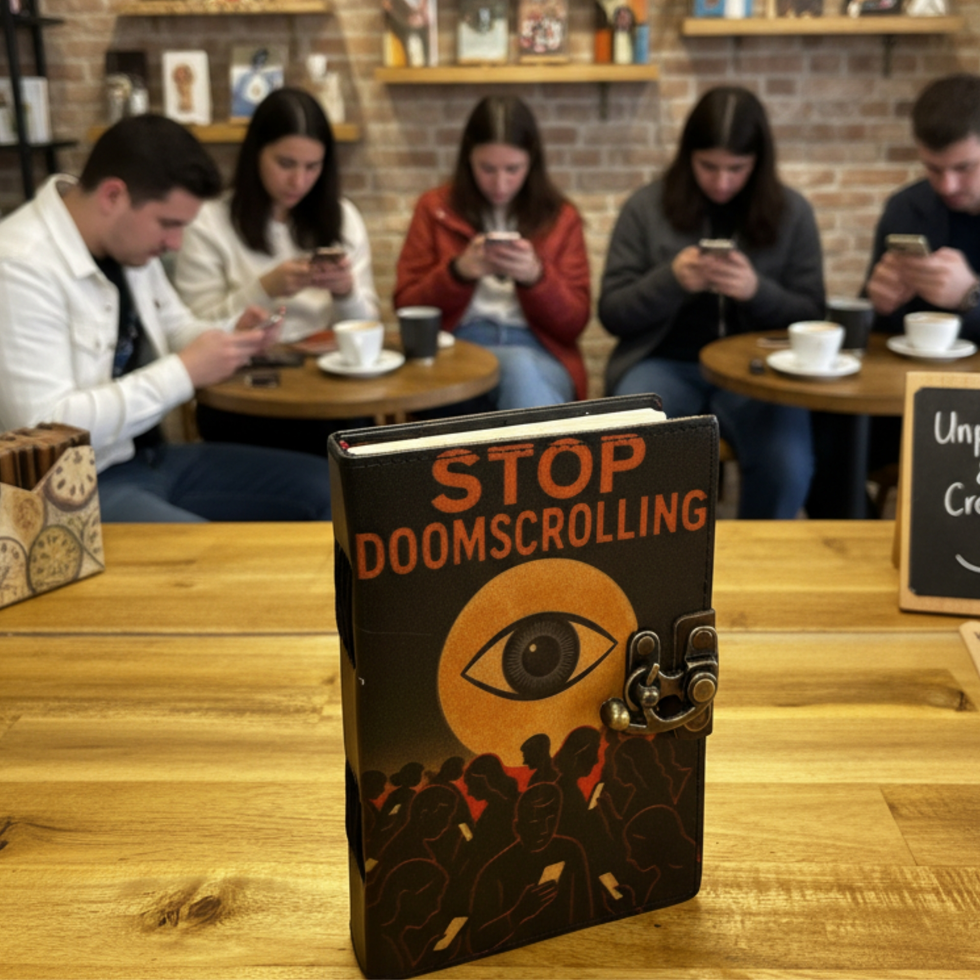 O design estampado e a mensagem “Pare de Fazer Doomscrolling” fazem deste caderno uma peça moderna com um toque consciente — perfeita para quem procura reduzir o ritmo, refletir e reconectar-se consigo mesmo.