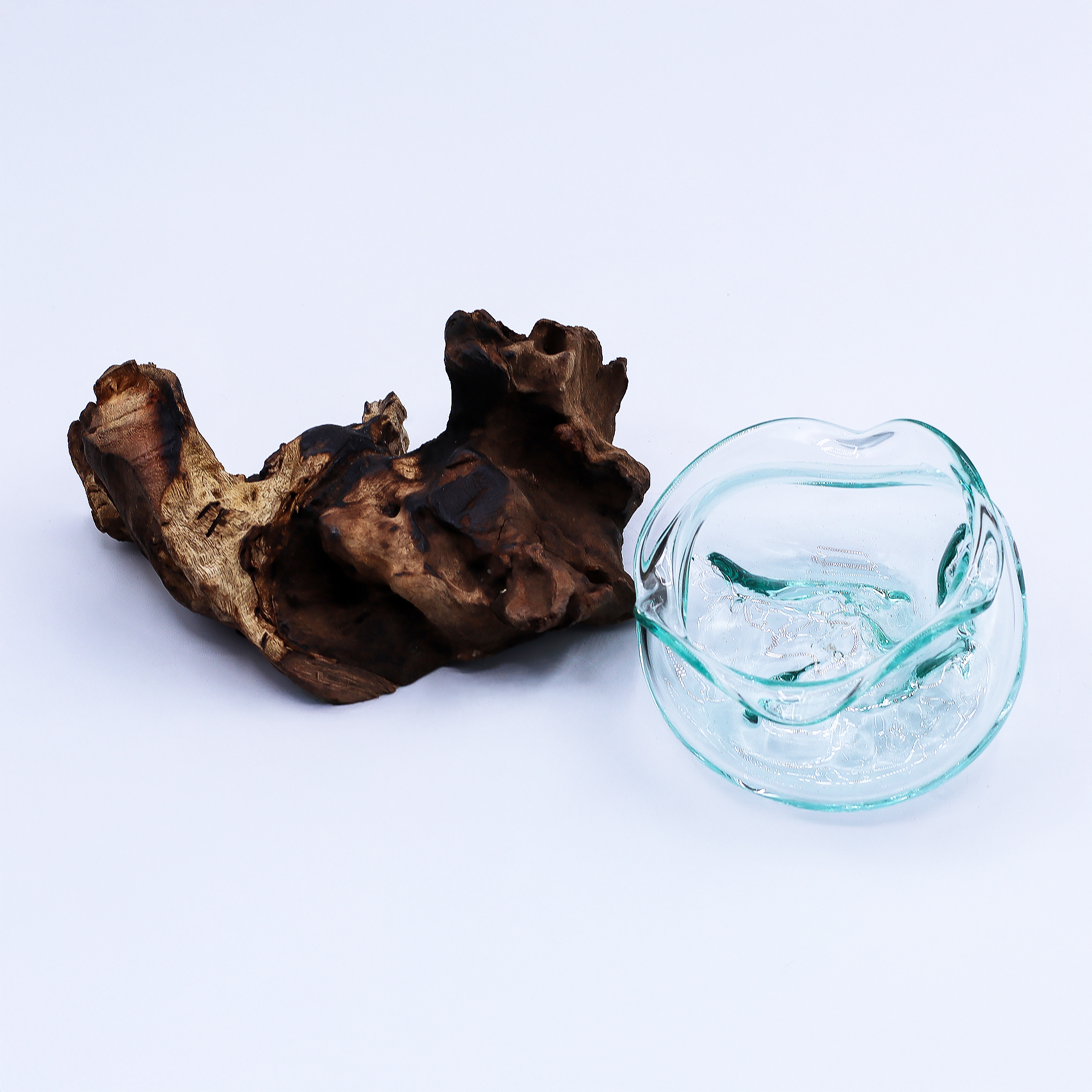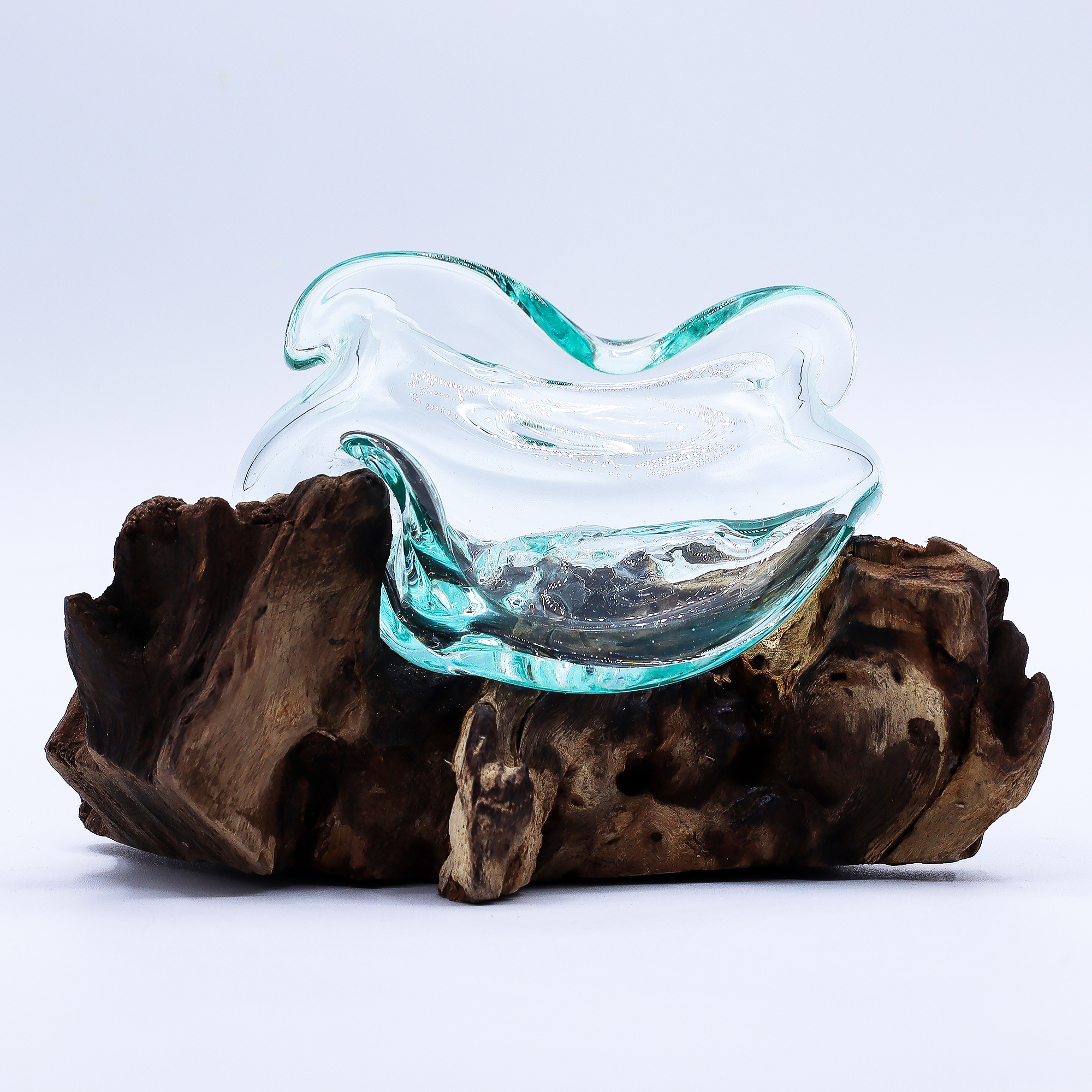 Eleve a sua coleção com a nossa Taça Ondulada de Vidro Fundido sobre Madeira, uma peça que combina artesanato e sustentabilidade. Feita à mão na Indonésia com vidro reciclado moldado diretamente sobre madeira recuperada de Gamal, cada peça é totalmente única. As ondulações e curvas orgânicas do vidro encaixam naturalmente na base, criando um efeito escultórico que se destaca em qualquer exposição.