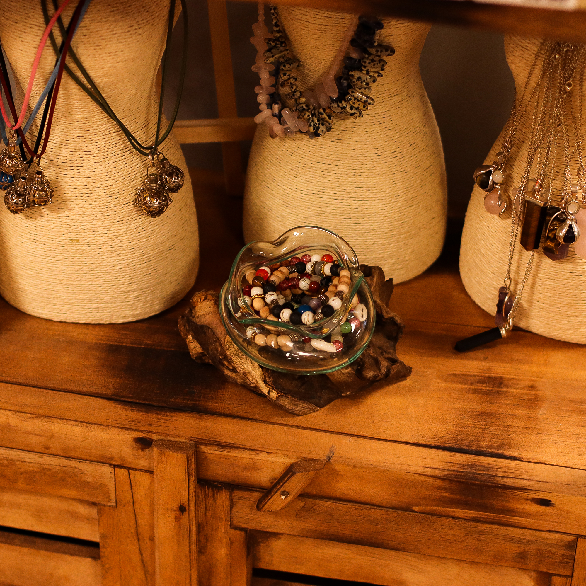 Perfeita para apresentar velas de chá, flores flutuantes, conchas ou pedras decorativas, esta taça adapta-se facilmente a coleções de spa, bem-estar, decoração natural ou eco-living. O vidro transparente com subtom aqua harmoniza lindamente com os tons terrosos da madeira, ajustando-se a estilos costeiros, boho ou rústicos.