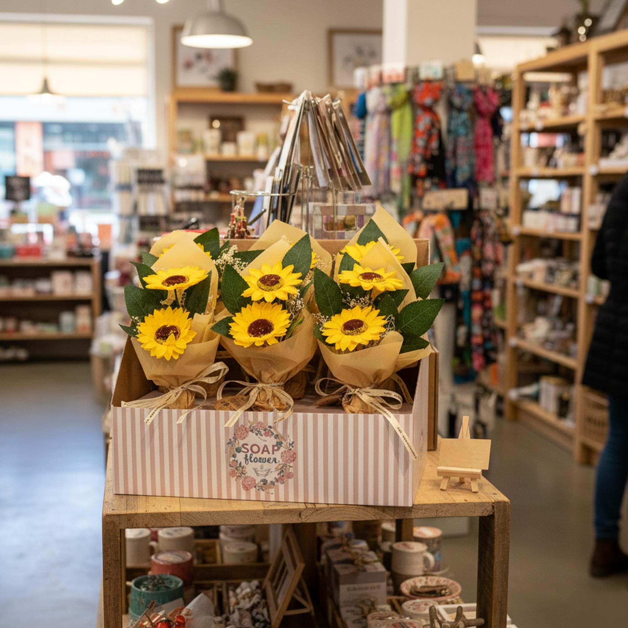 Cada caixa contém seis ramos duplos de girassóis de sabão, cuidadosamente trabalhados e envoltos num elegante embrulho, prontos a vender.