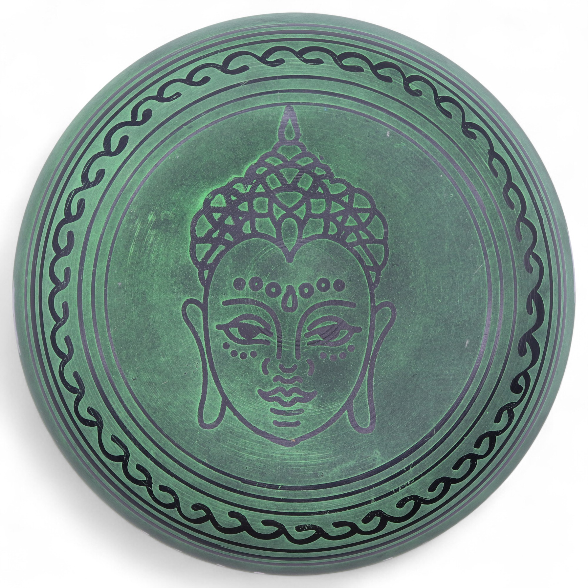 Destaca-se pelo tamanho generoso, pela cor intensa e pela capacidade de emitir um som forte, profundo e duradouro que enche qualquer espaço. Feita à mão com foco na clareza e profundidade sonora, a sua forma distinta de “cogumelo” — com borda ampla e perfil curvado — amplifica a vibração, criando uma experiência sensorial envolvente. O acabamento verde confere-lhe um toque natural, moderno e sereno, perfeito para espaços de meditação, lojas de bem-estar, presentes espirituais ou decoração sofisticada.