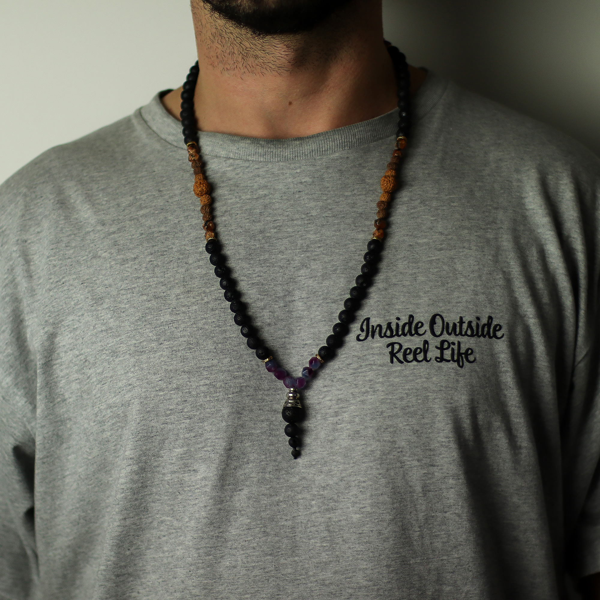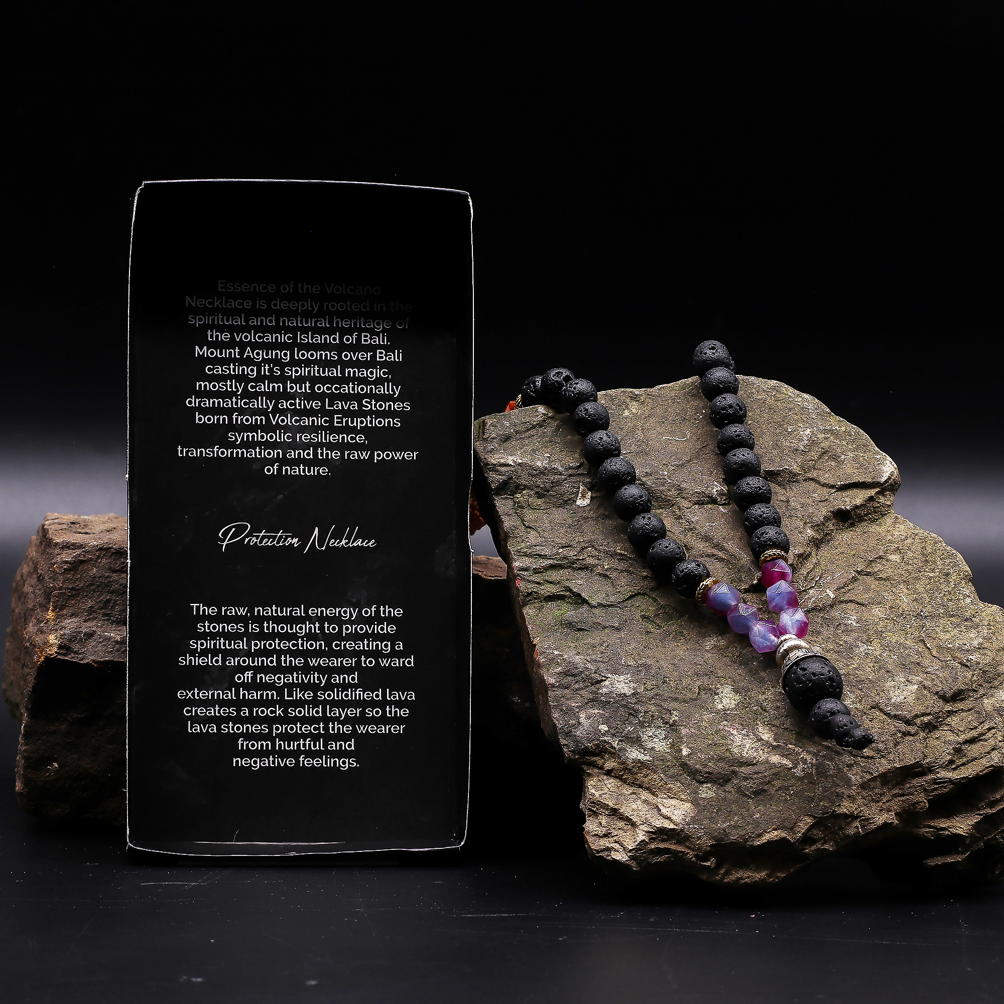 O Colar Essência do Vulcão – Abraçar o Lado Sombrio é uma peça artesanal criada na Indonésia que convida à reflexão, coragem e transformação interior. O design combina contas de lava em preto profundo com pedras naturais em tons de laranja e roxo, representando equilíbrio espiritual, despertar interior e a jornada de aceitação das nossas partes ocultas.