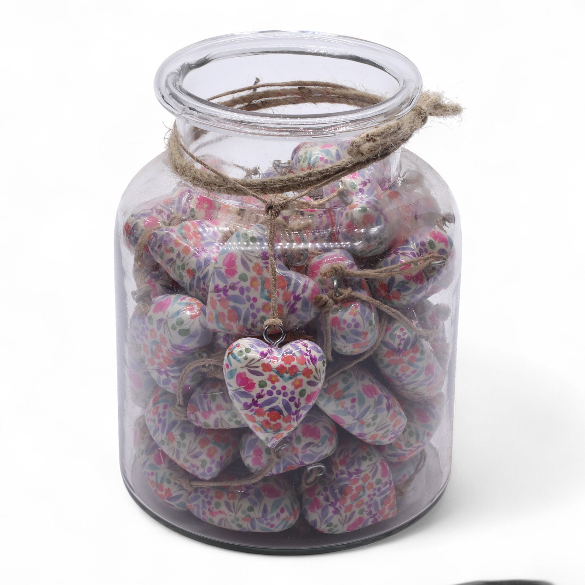 Cada frasco inclui 50 corações grandes cuidadosamente produzidos em madeira de mangueira e finalizados com um brilho esmaltado que realça os delicados padrões florais e vintage.
