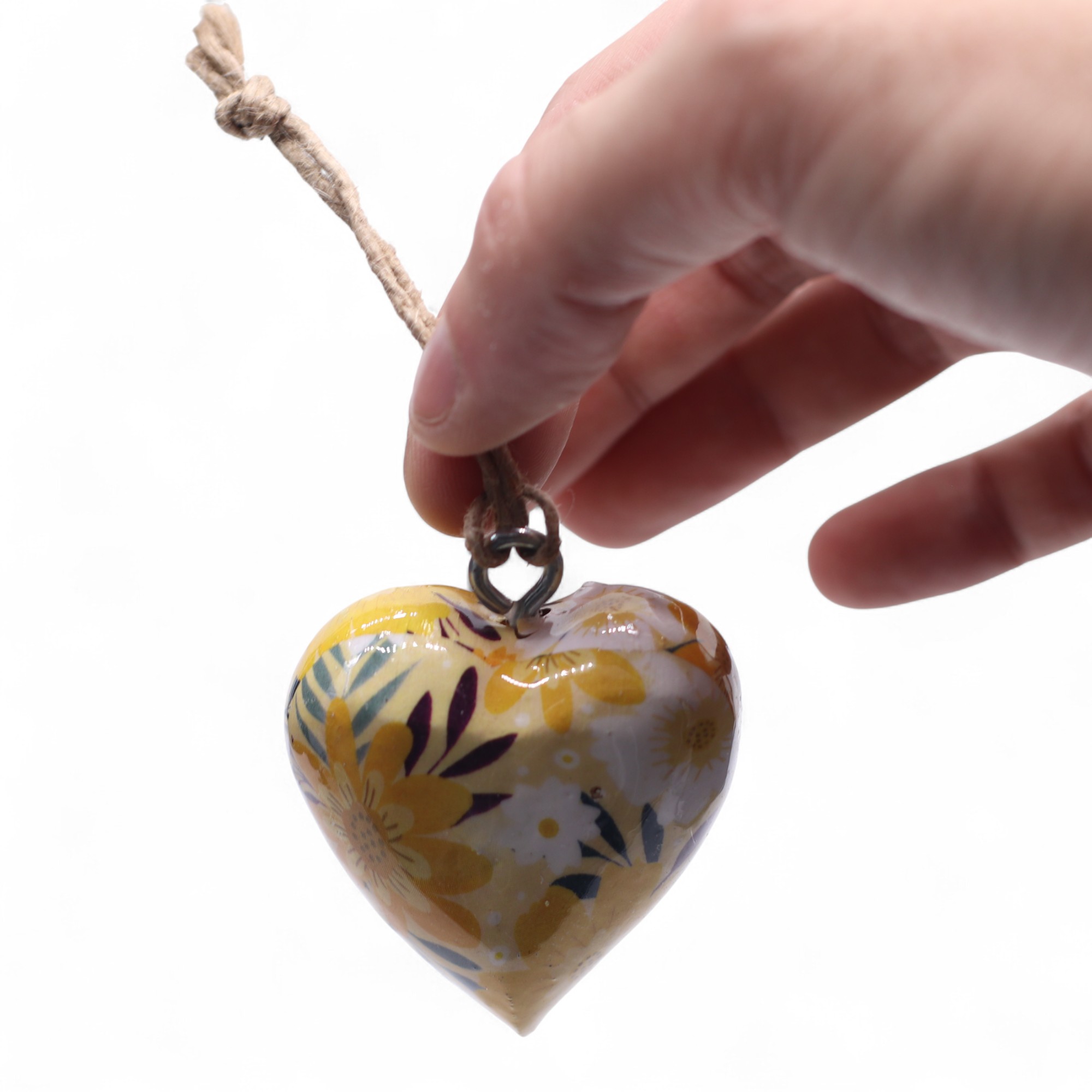O padrão floral amarelo, símbolo de alegria, vitalidade e otimismo. O amarelo é uma cor que transmite luz e boa disposição, tornando estas peças perfeitas para criar ambientes acolhedores e cheios de vida. Ideais para presentes, lembranças ou decorações sazonais, como o Natal, casamentos ou espaços comerciais, estes corações acrescentam um toque de romantismo rústico e artesanal.