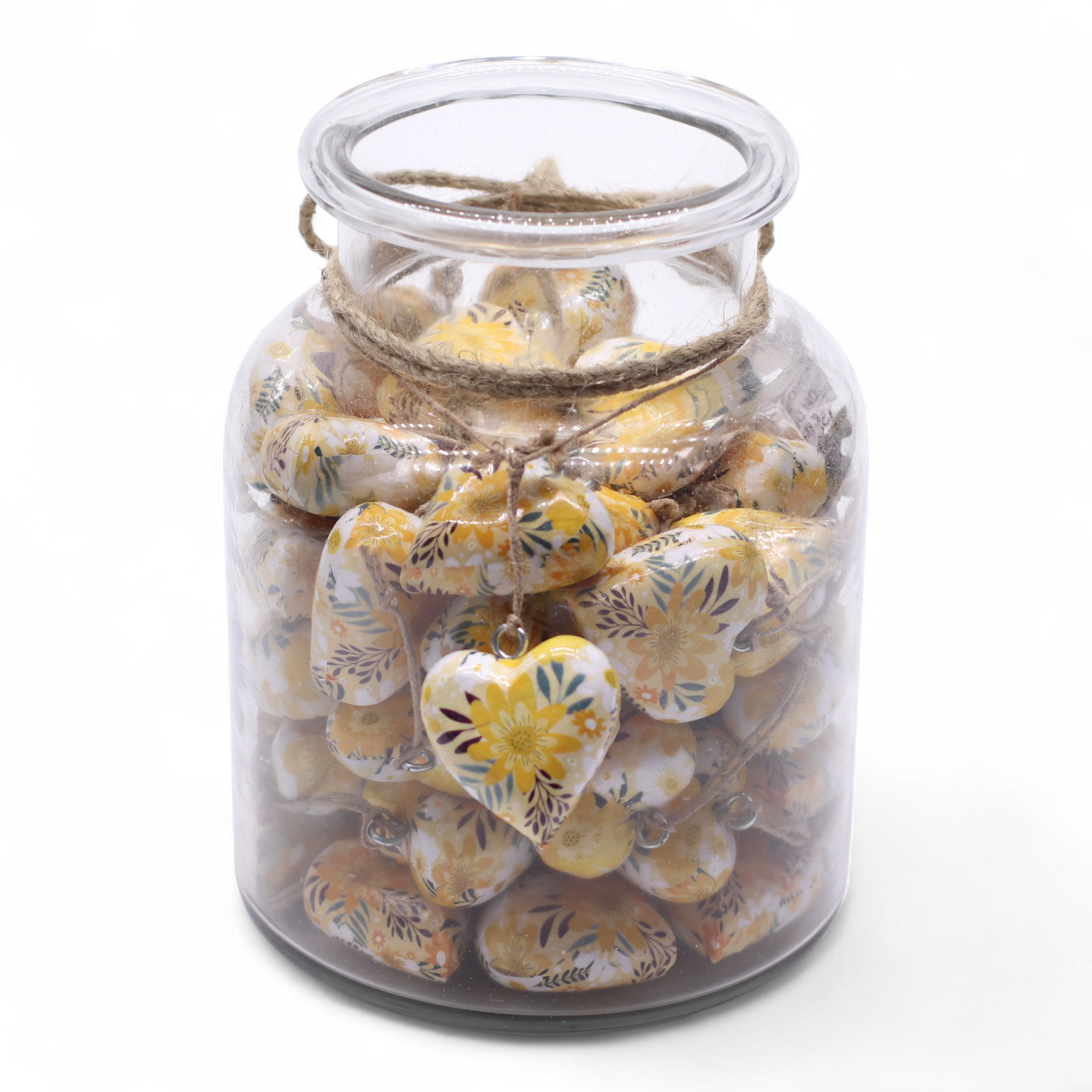 Cada frasco inclui 50 corações grandes cuidadosamente produzidos em madeira de mangueira e finalizados com um brilho esmaltado que realça os delicados padrões florais e vintage.